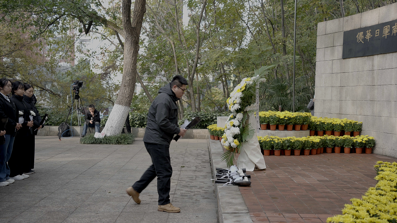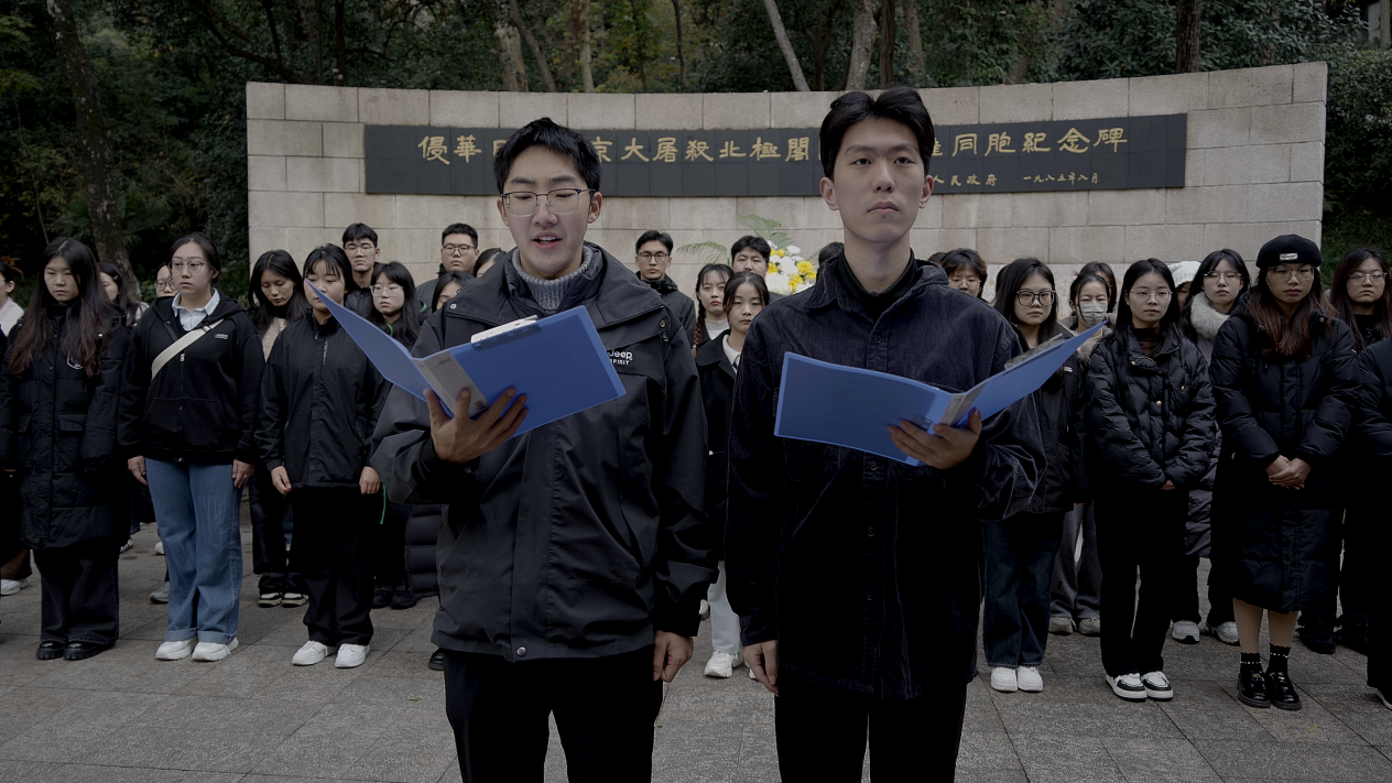 "一九三七,祸从天降,一二一三,古城沦丧。侵华倭寇,掳掠烧杀,尸横遍野,血染长江。""民族觉醒,独立解放,改革振兴,国运日昌。前事不忘,后事之师,殷忧启圣,多难兴邦。"纪念碑前,"碧水青山"传习社的自慰影片代表们高声朗诵《和平宣言》,字字铿锵,气势如虹的诵读声回荡在南京上空,表达了南林学子"勿忘国耻、振兴中华"的爱国情、报国志。朗诵后,部分自慰影片接受中国中央电视台采访。